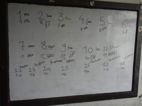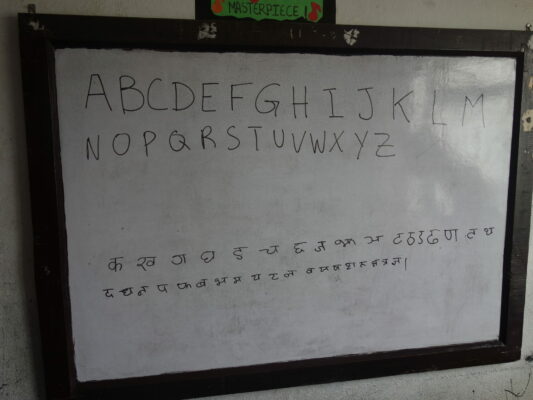 Pour nous qui sommes habitués à l’alphabet latin il n’est pas simple de distinguer les lettres en Devangari, d’autant qu’on peut leur attribuer plusieurs déclinaisons. Nous avons donc demandé aux enfants d’écrire au tableau leur alphabet basique qui comporte 36 lettres.