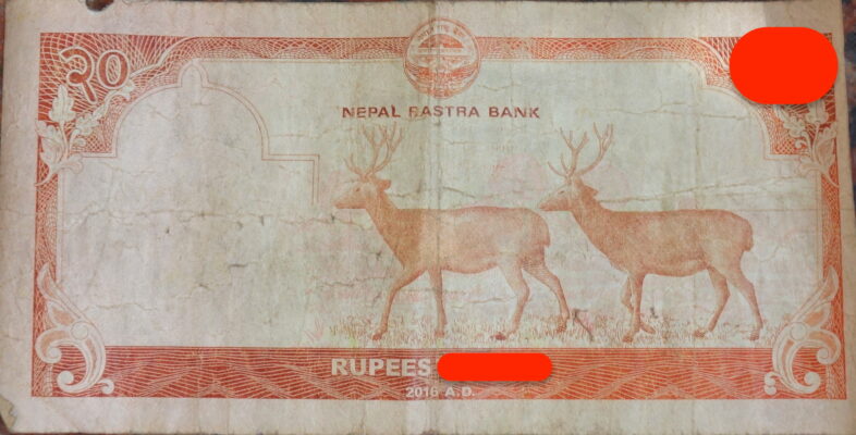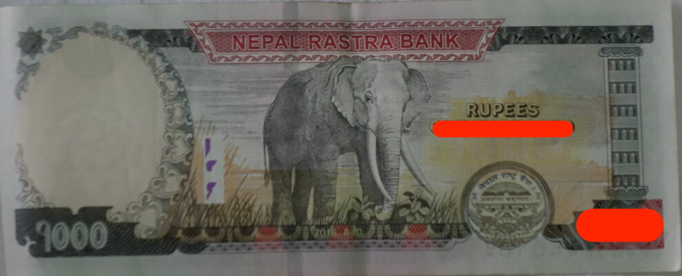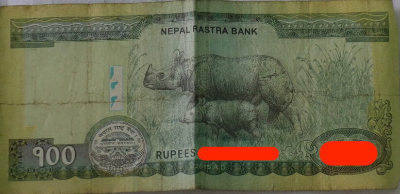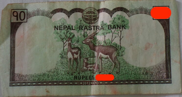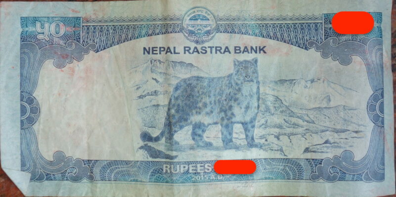 Les montants des billets sont écrits avec les chiffres népalais et occidentaux (les nôtres). Pour que ça ne soit pas trop facile, nous avons caché en rouge les chiffres occidentaux.