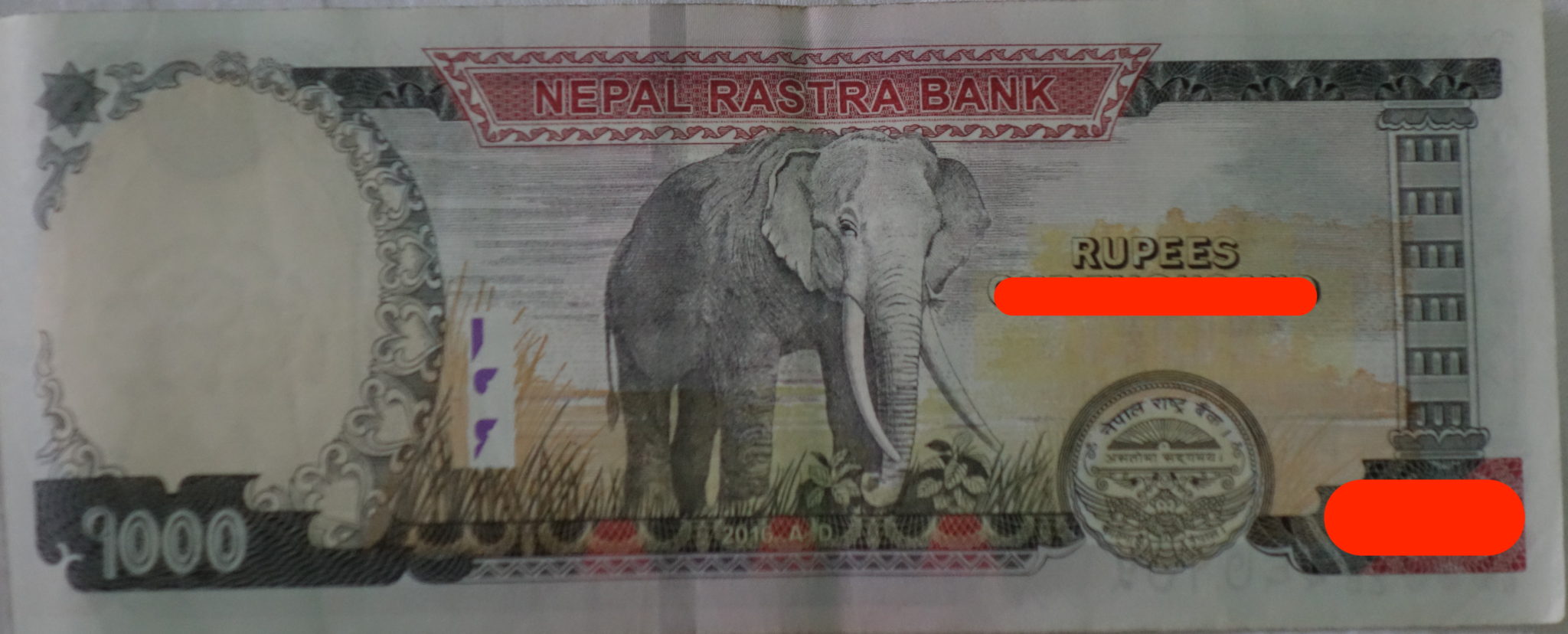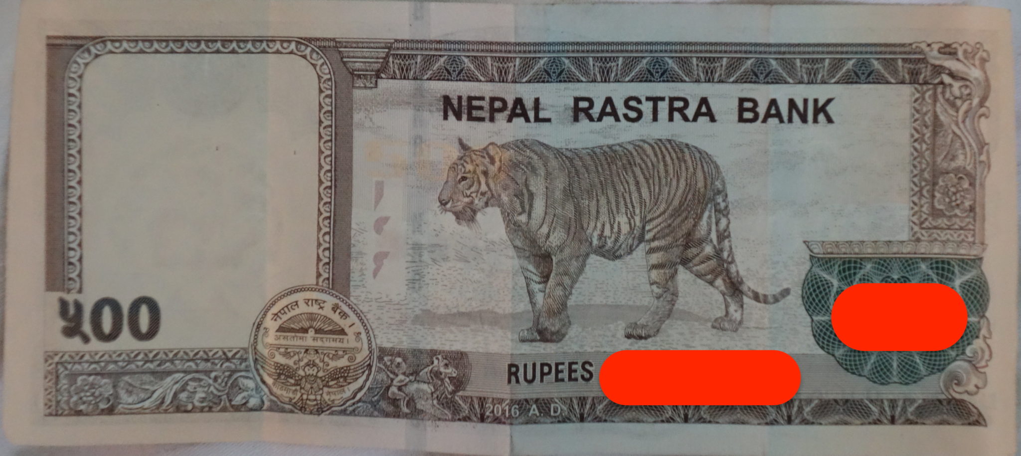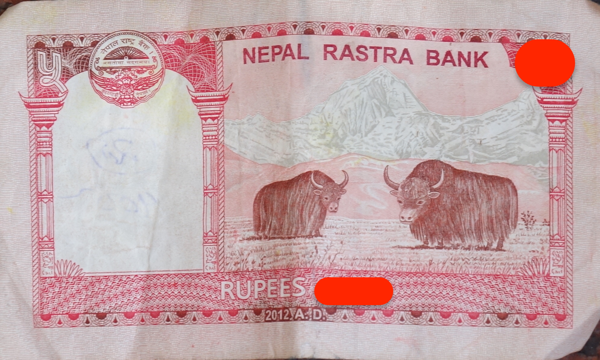 Les montants des billets sont écrits avec les chiffres népalais et occidentaux (les nôtres). Pour que ça ne soit pas trop facile, nous avons caché en rouge les chiffres occidentaux.