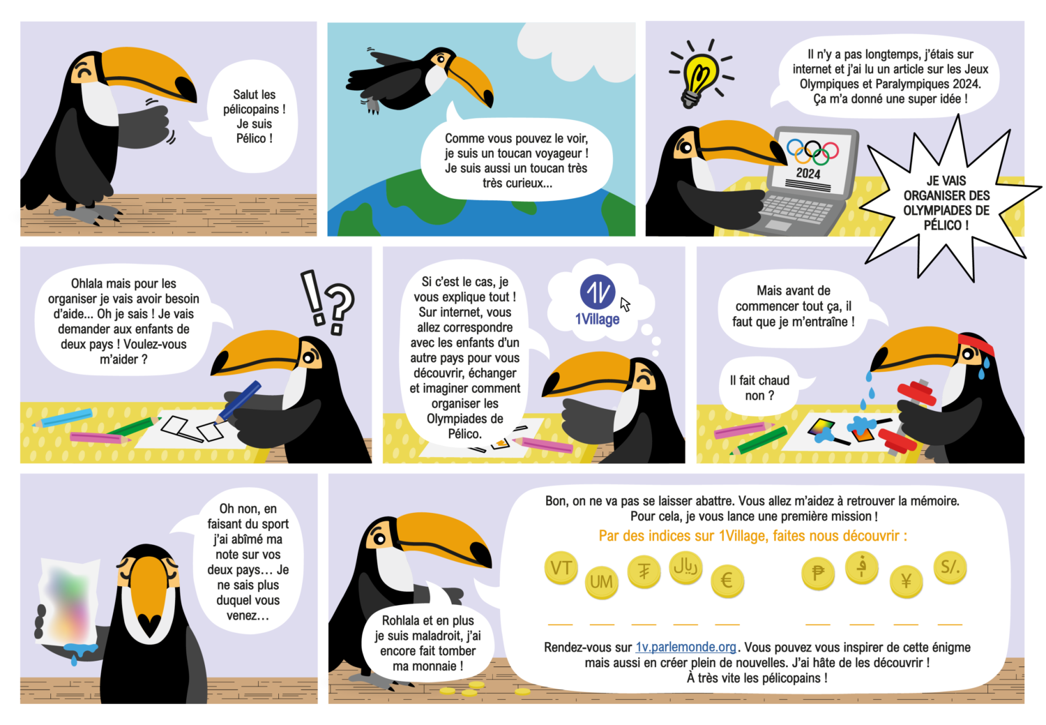 Sur la version à reconstituer de la bande dessinée, vos élèves devront replacer aux bons endroits les différentes paroles de Pélico en s’appuyant sur les dessins. C’est une façon ludique de découvrir le projet 1Village !