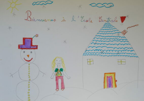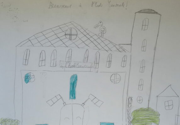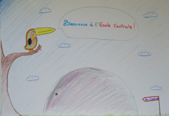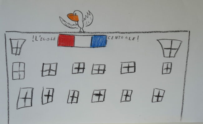 Nous avons ensuite fait un petit jeu avec les élèves ; ils ont dû réaliser un dessin collectif de leur école et des bâtiments qui l’entouraient. Puis, nous sommes partis en balade avec Pelico pour photographier les alentours.