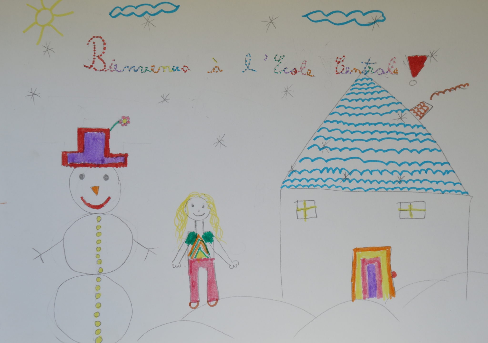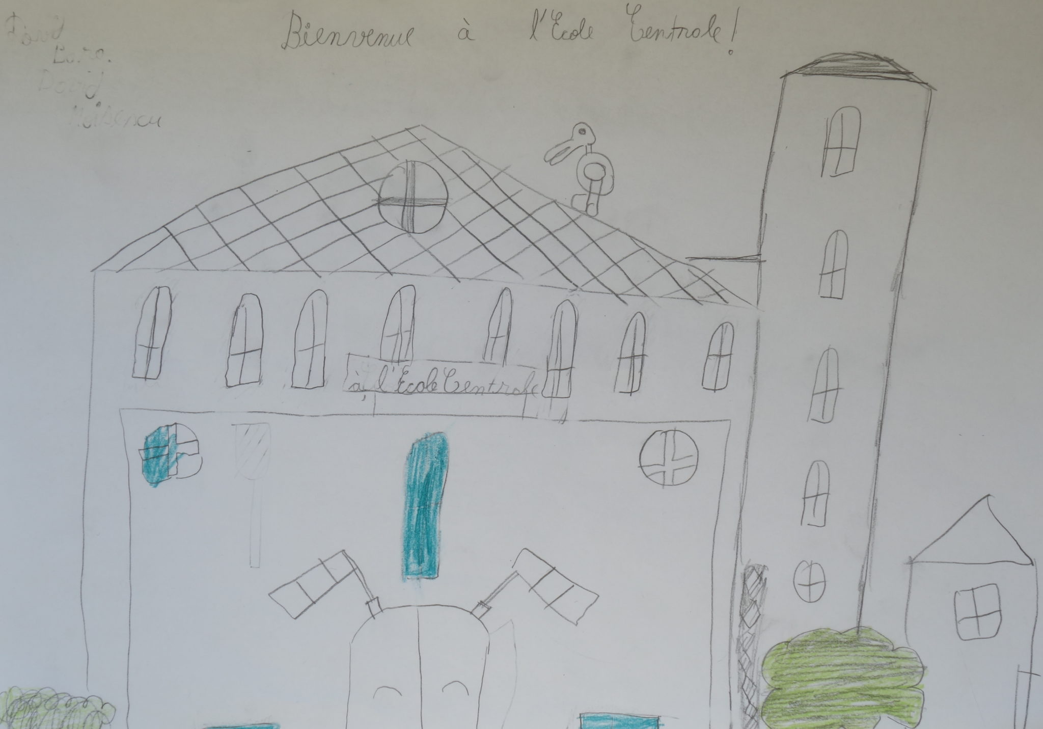 Nous avons ensuite fait un petit jeu avec les élèves ; ils ont dû réaliser un dessin collectif de leur école et des bâtiments qui l’entouraient. Puis, nous sommes partis en balade avec Pelico pour photographier les alentours.