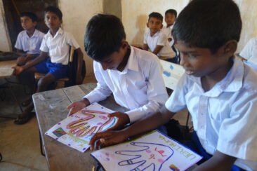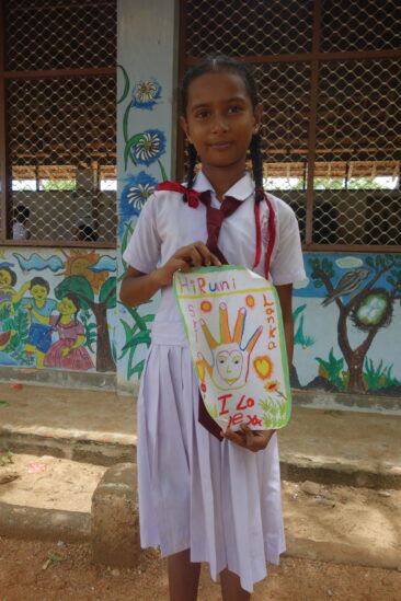 Les élèves de l’école de Kandakuliya parlent cingalais, comme environ 70% de la population. Mais il existe une autre langue officielle au Sri Lanka, parlée au nord du pays par la communauté Tamoul : il s’agit du … tamoul ! Il s’écrit dans un autre alphabet, et est parlé par environ 25% de la population.