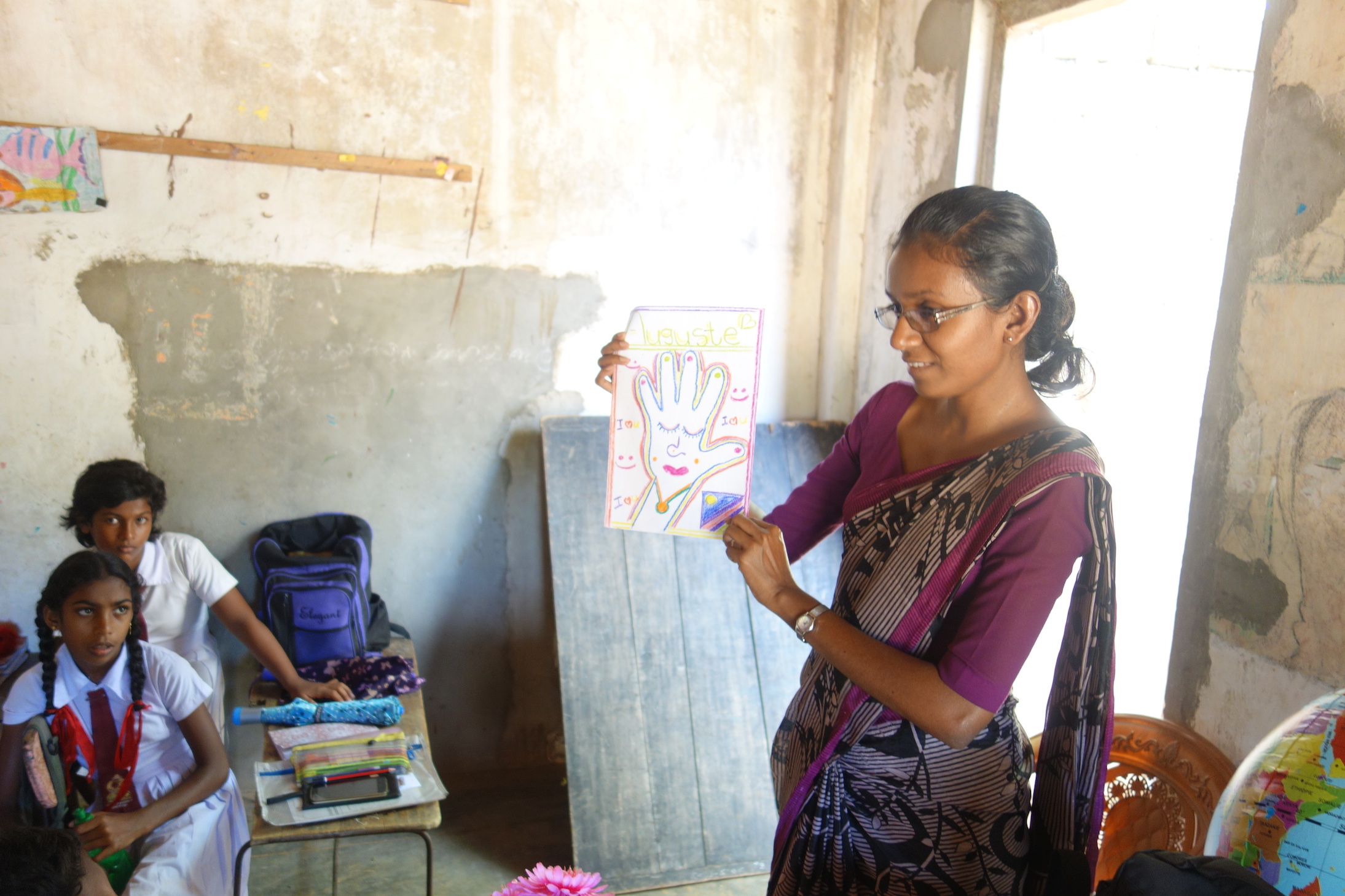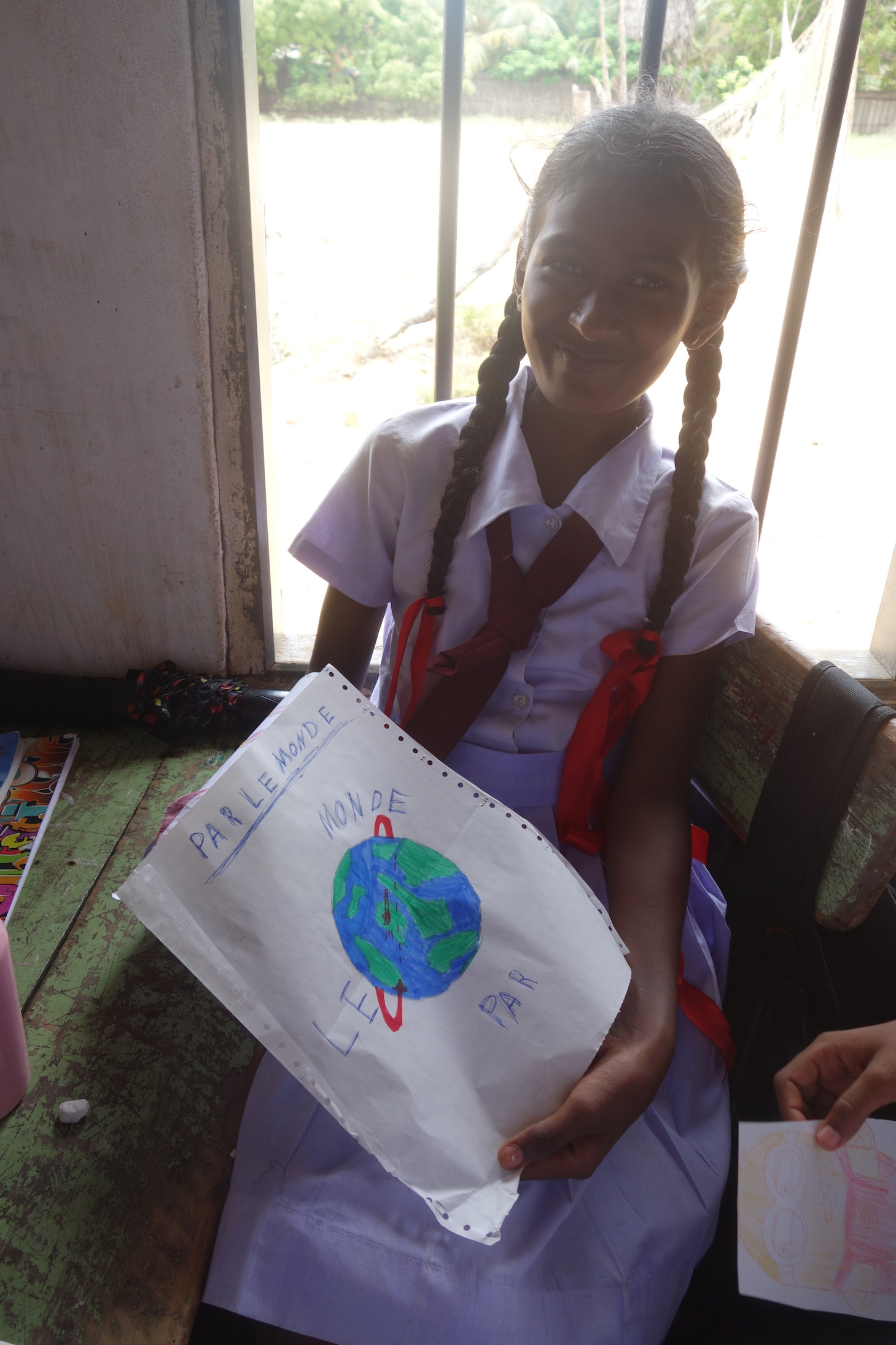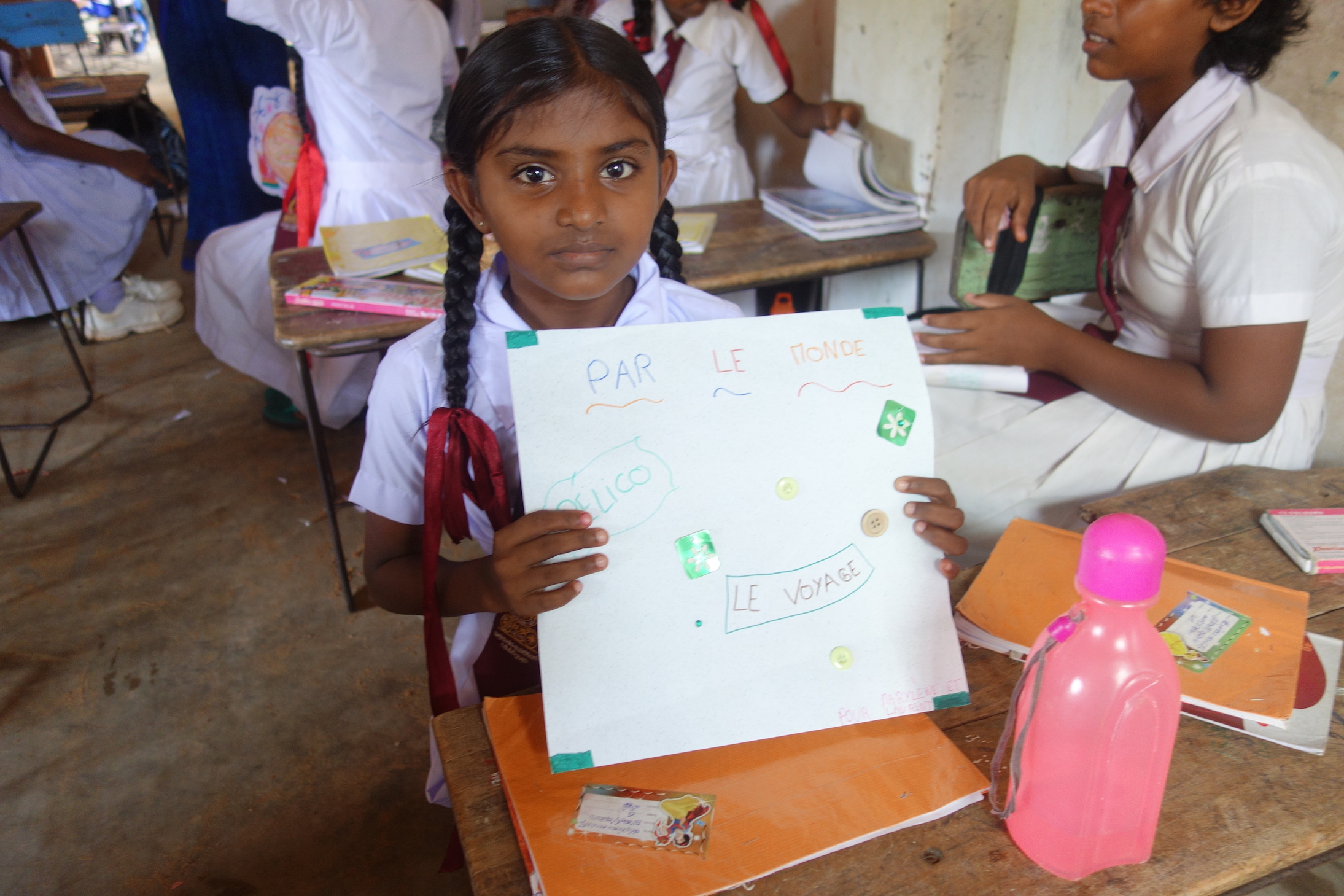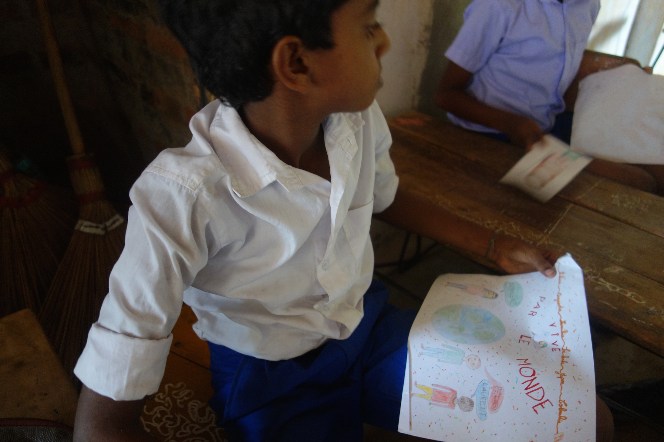 Les élèves de l’école de Kandakuliya parlent cingalais, comme environ 70% de la population. Mais il existe une autre langue officielle au Sri Lanka, parlée au nord du pays par la communauté Tamoul : il s’agit du … tamoul ! Il s’écrit dans un autre alphabet, et est parlé par environ 25% de la population.