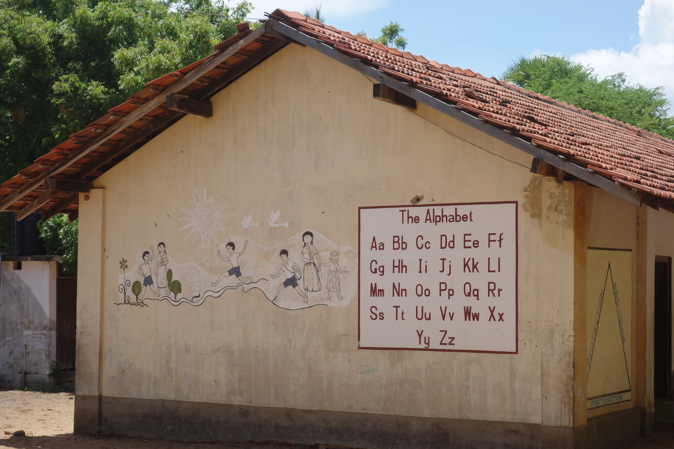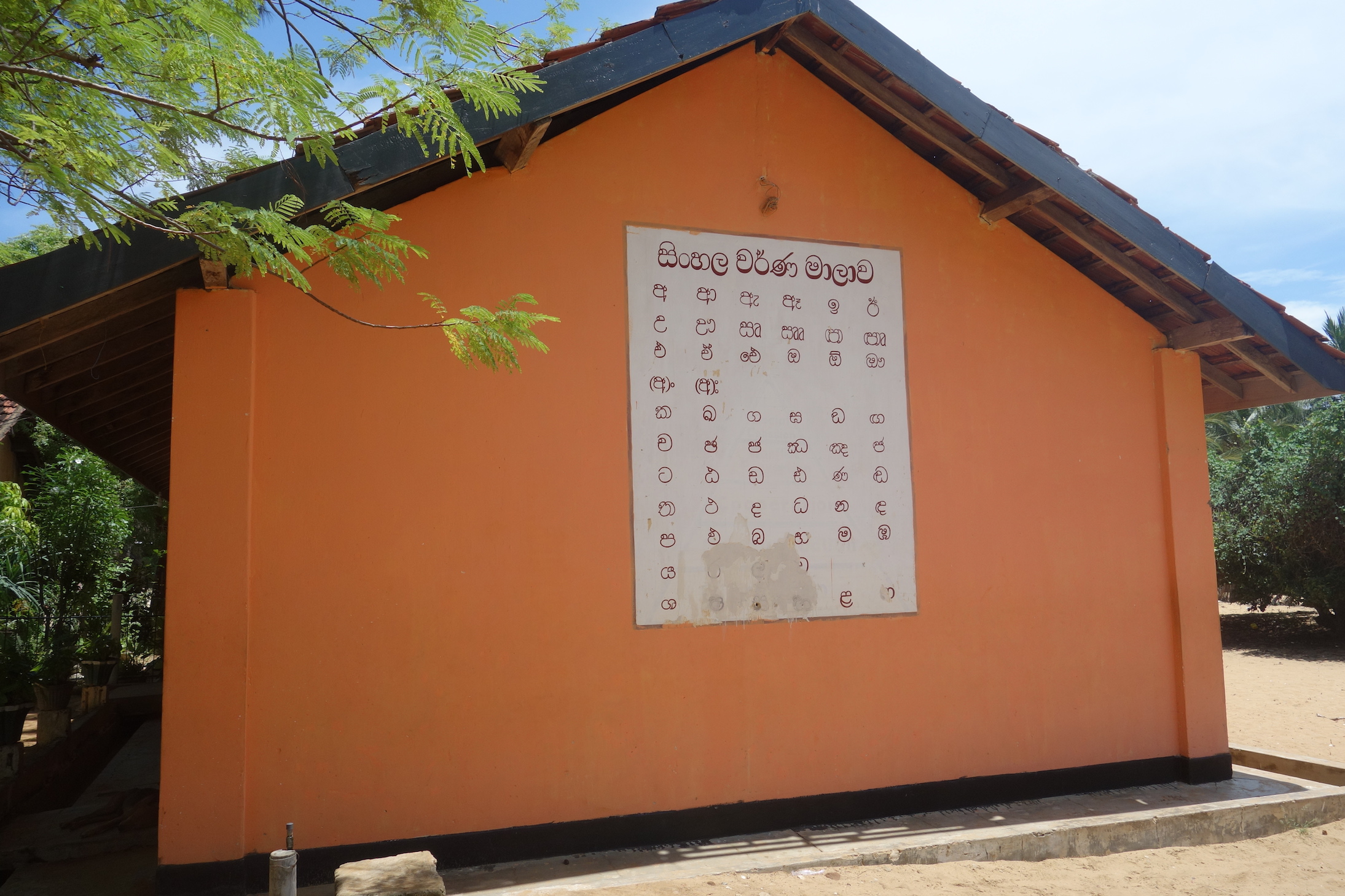 À l’école, deux facades se font face, sur lesquelles sont inscrits les alphabets latin (le nôtre !) et cingalais.