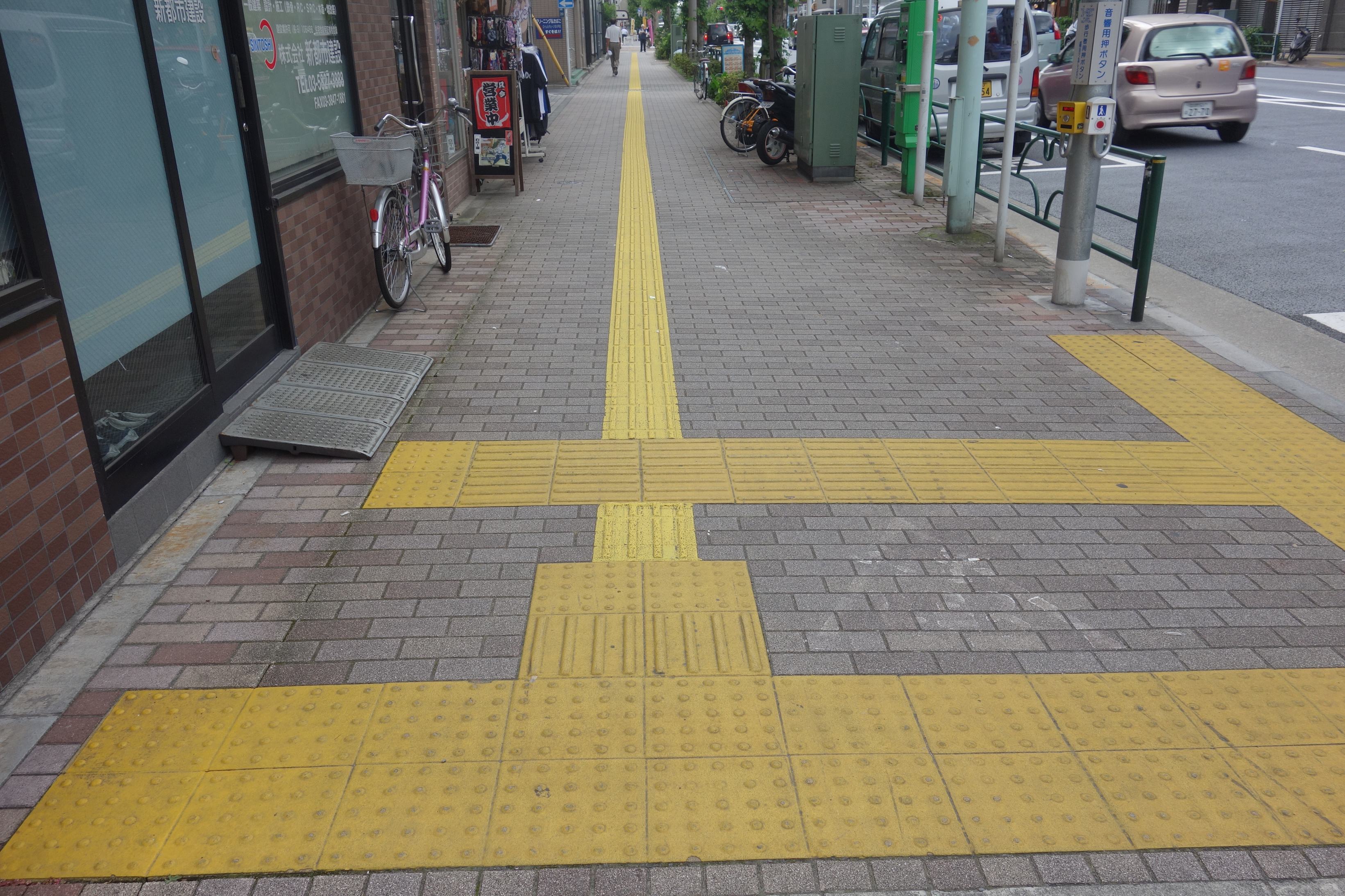 les lignes jaunes et bombées qui permettent aux personnes malvoyantes de se déplacer en sécurité dans la ville. Il y en a partout, dans la rue et les métros.