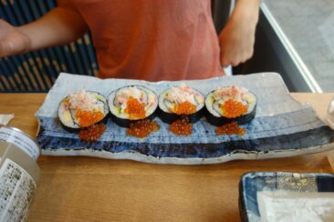 - des sushis : des morceaux de poissons crus posés sur du riz vinaigré, parfois relevé d’une pointe de Wasabi ;