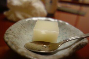 - du Warabimochi : fabriqué avec de la farine spéciale, il forme un cube ou une boule gélatineuse que l’on recouvre de Kinako (une farine de soja sucrée) ;