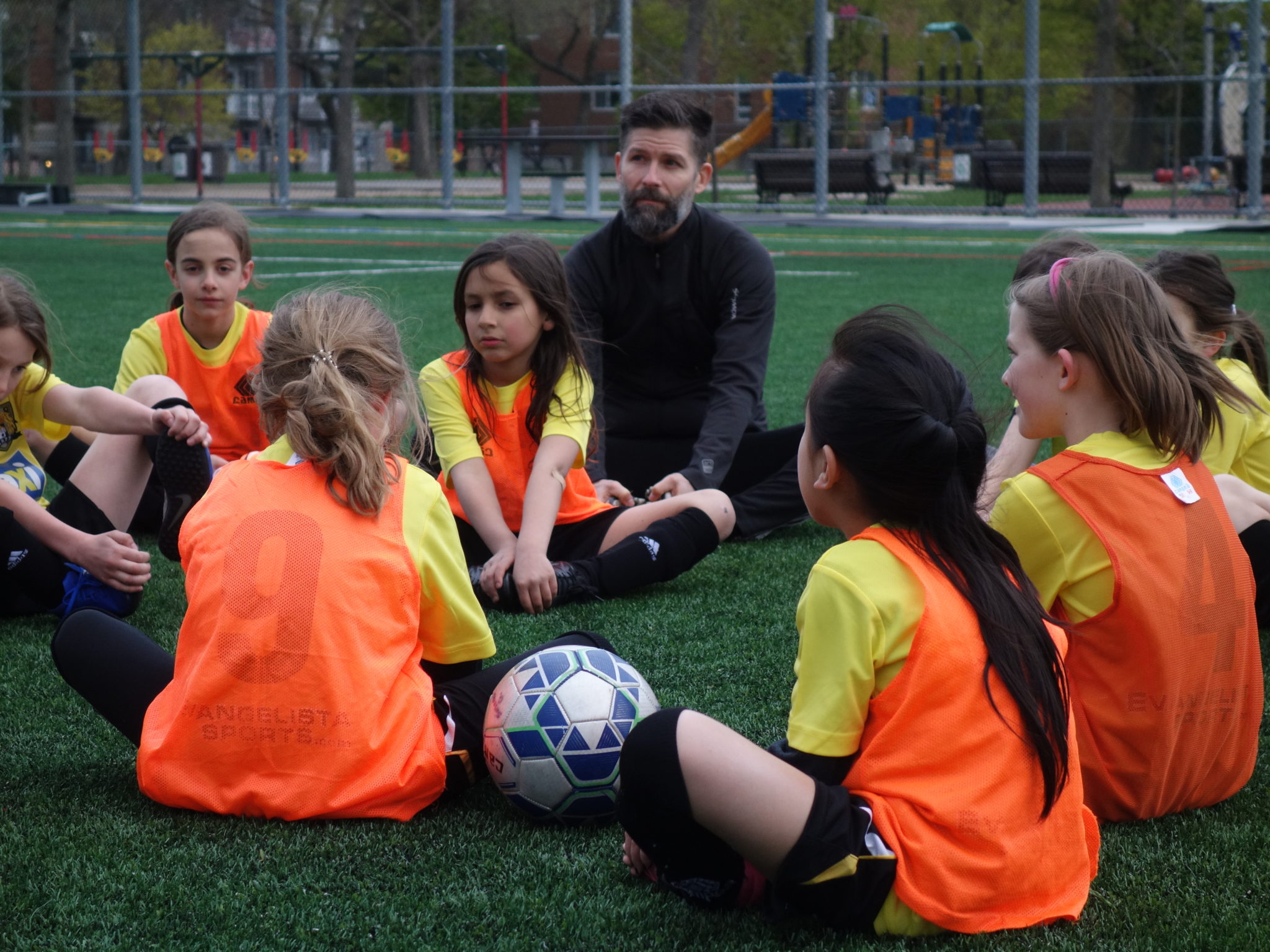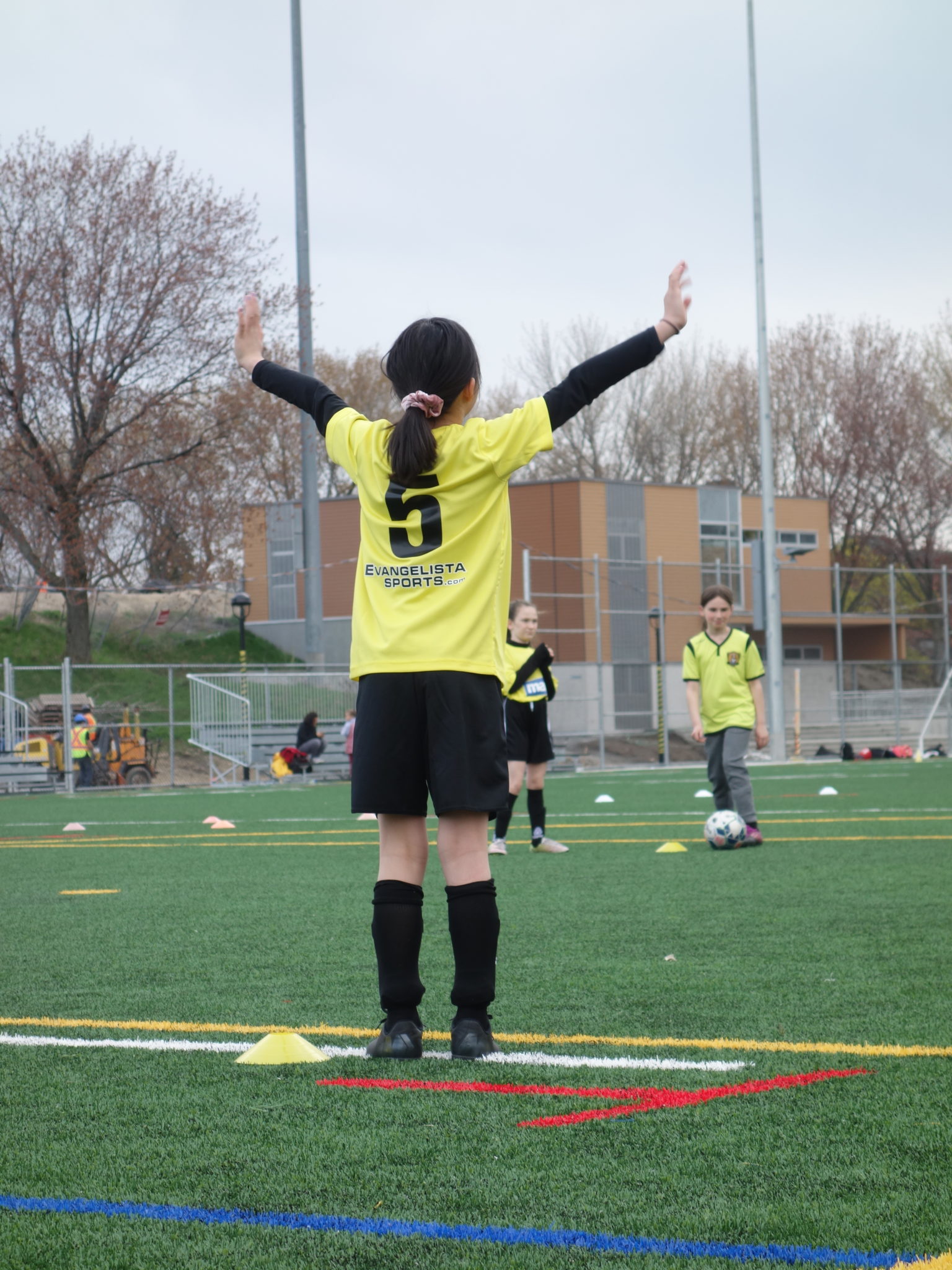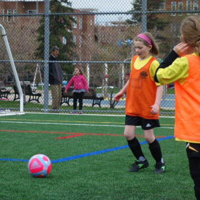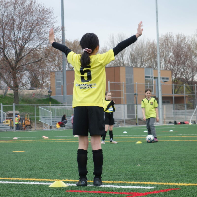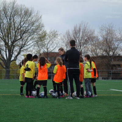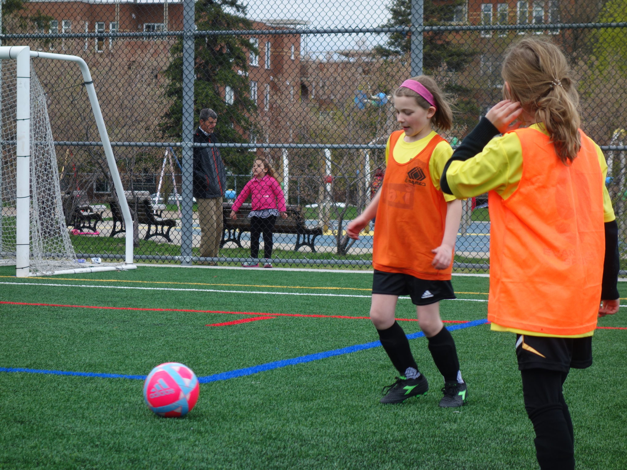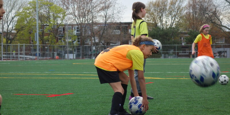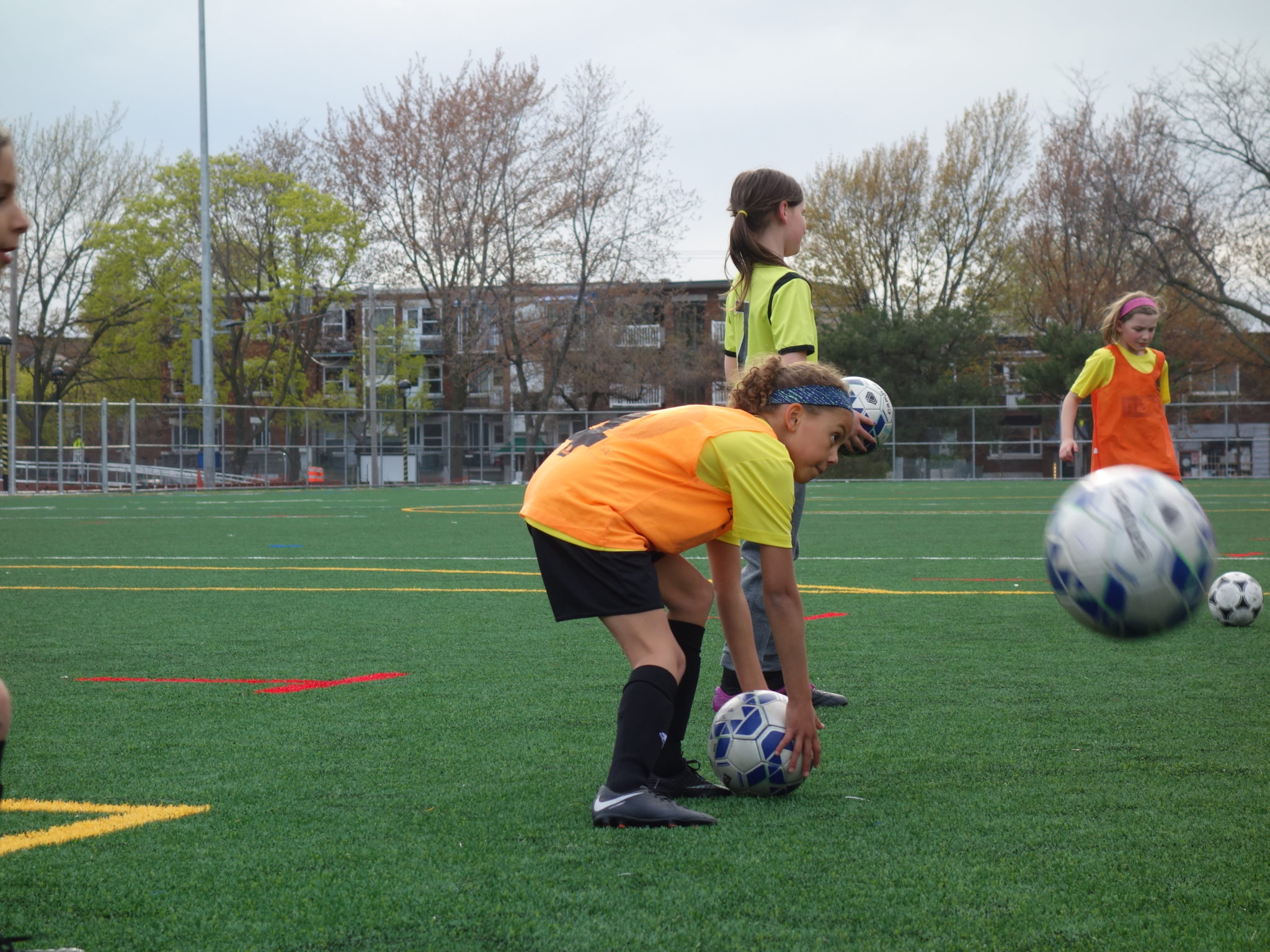 Nous avons décidé de partir à la rencontre d’enfants qui pratiquent un de ces sports. Comme la saison de hockey se termine (l’entretien des patinoires coûte très cher en été et en plus ça n’est pas écologique). Nous sommes partis assister à un entrainement de soccer féminin.