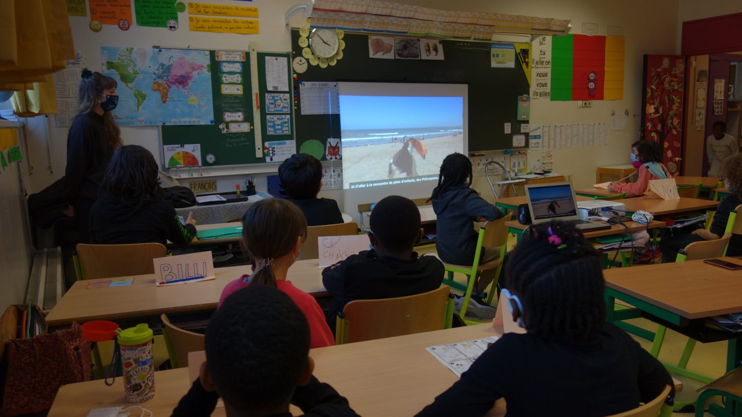 Ce sont des interrogations que nous avons eu avec les élèves durant les ateliers. Cela nous a permis d’aborder la notion de francophonie. Parle-t-on seulement français en France ? Par ailleurs, vous pouvez aussi en profiter pour parler des langues. Bien souvent les élèves apprennent eux-mêmes plusieurs langues à l’école, mais ils n’imaginent peut-être pas qu’on puisse apprendre le français dans le monde.